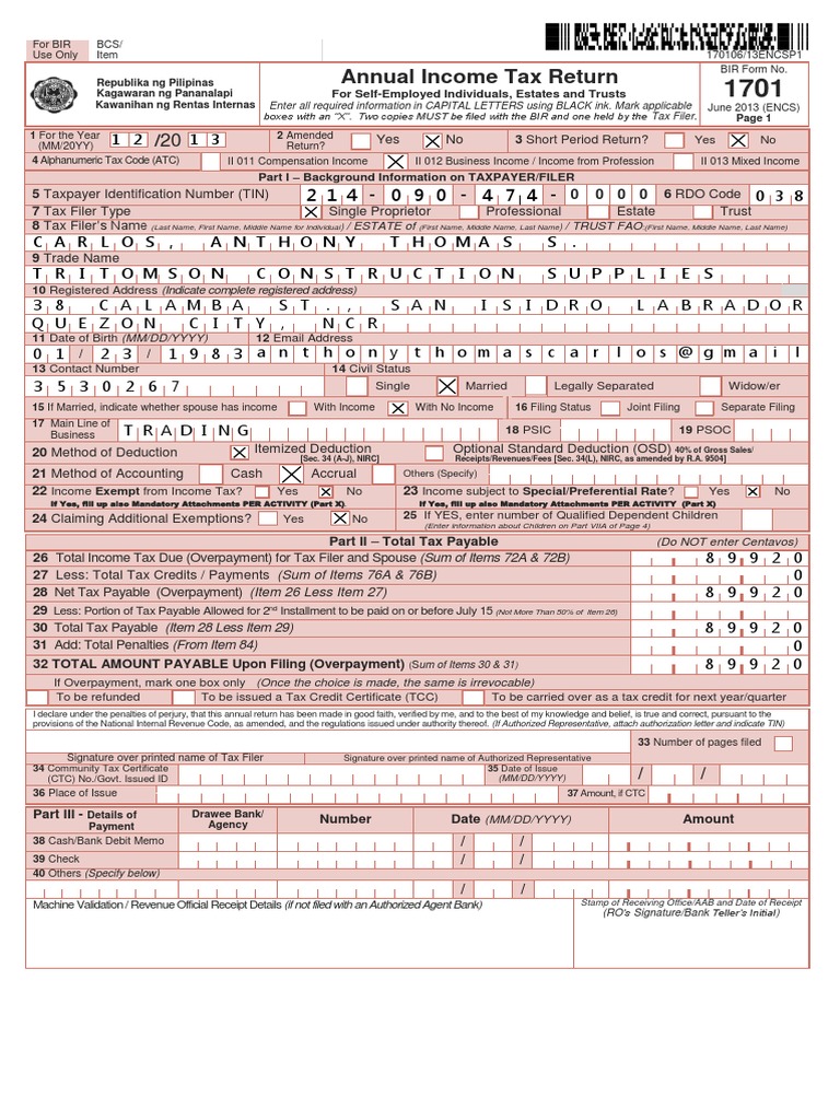 The bir form 1701 or the annual income tax return for self employed individuals estates and trusts shows all the transactions covering the calendar year of the taxpayer. 1701 form needs to be filed on or before april 15th annually and it should cover all those income from the previous tax year. According to bir this must be filed by the following individuals.