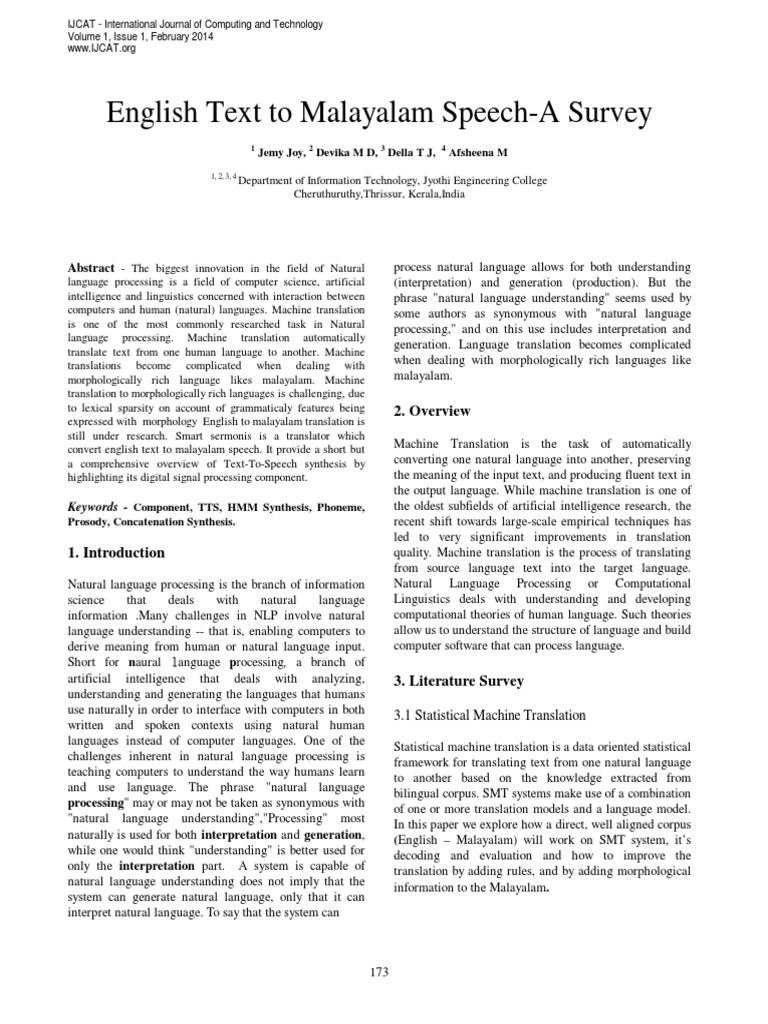 English Text To Malayalam Speech A Survey Speech Synthesis Parsing