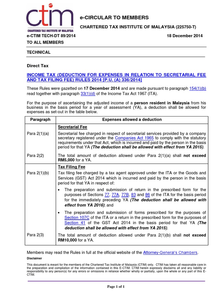 E Circular To Members Chartered Tax Institute Of Malaysia Tax Deduction Expense
